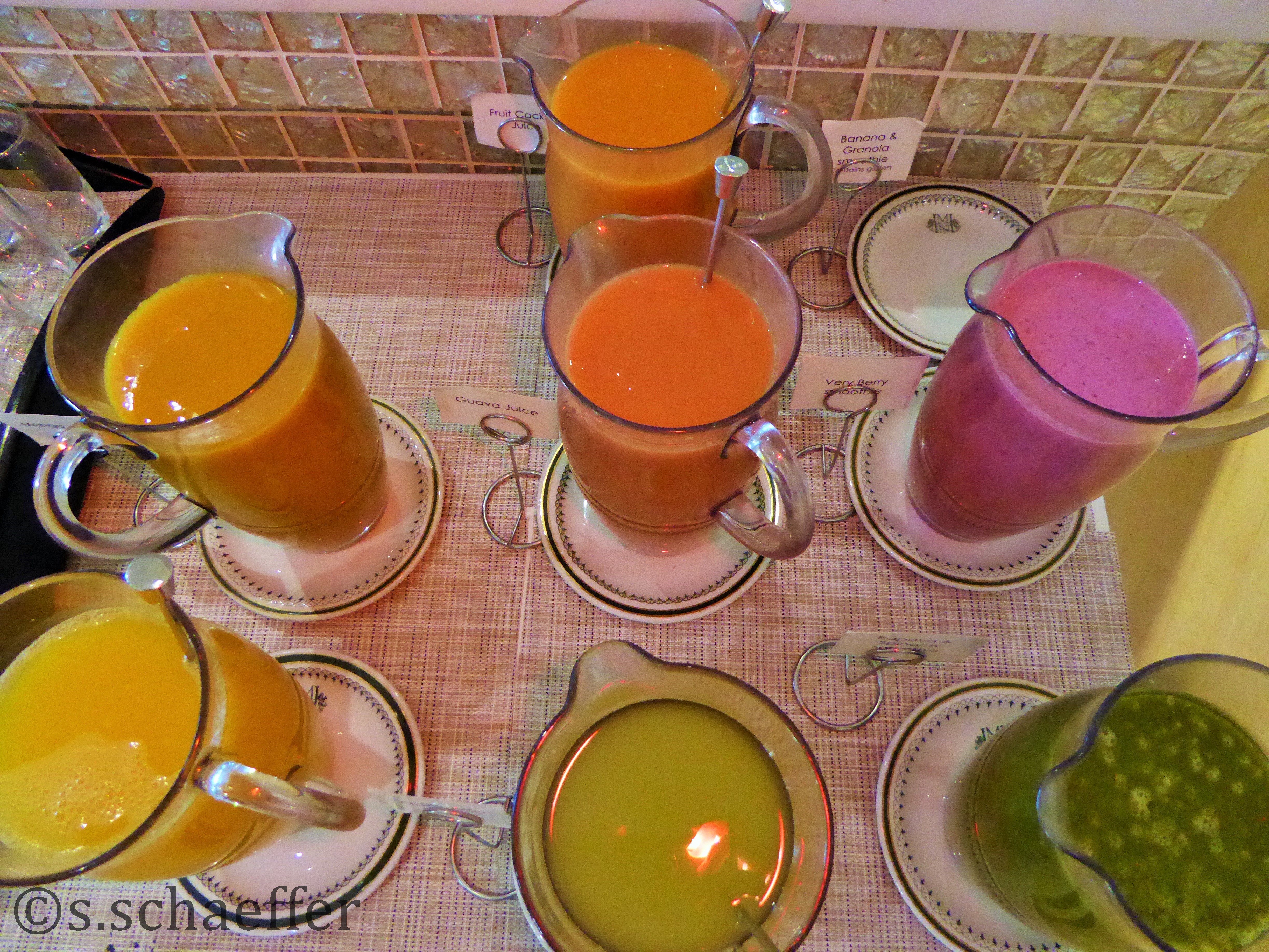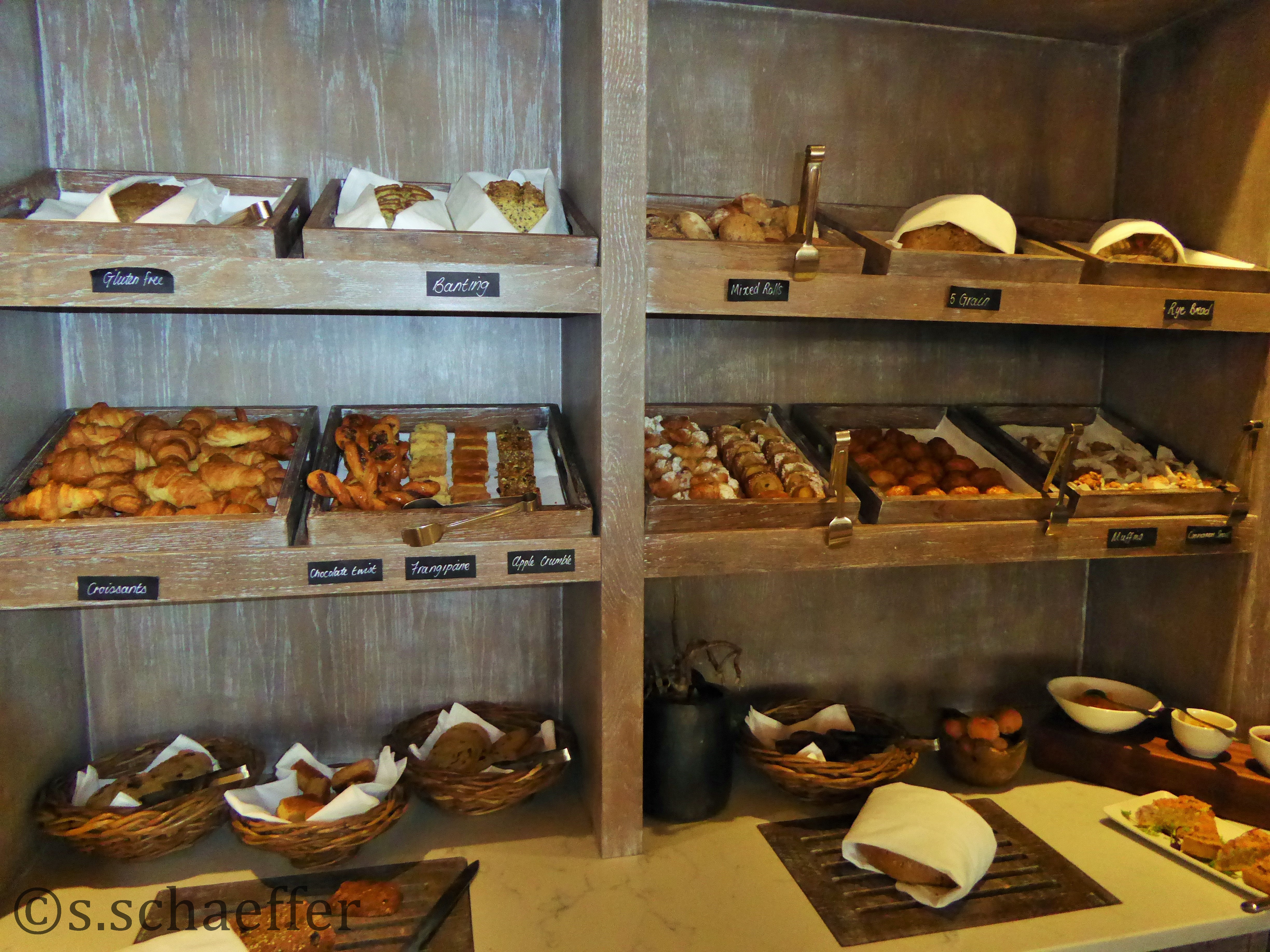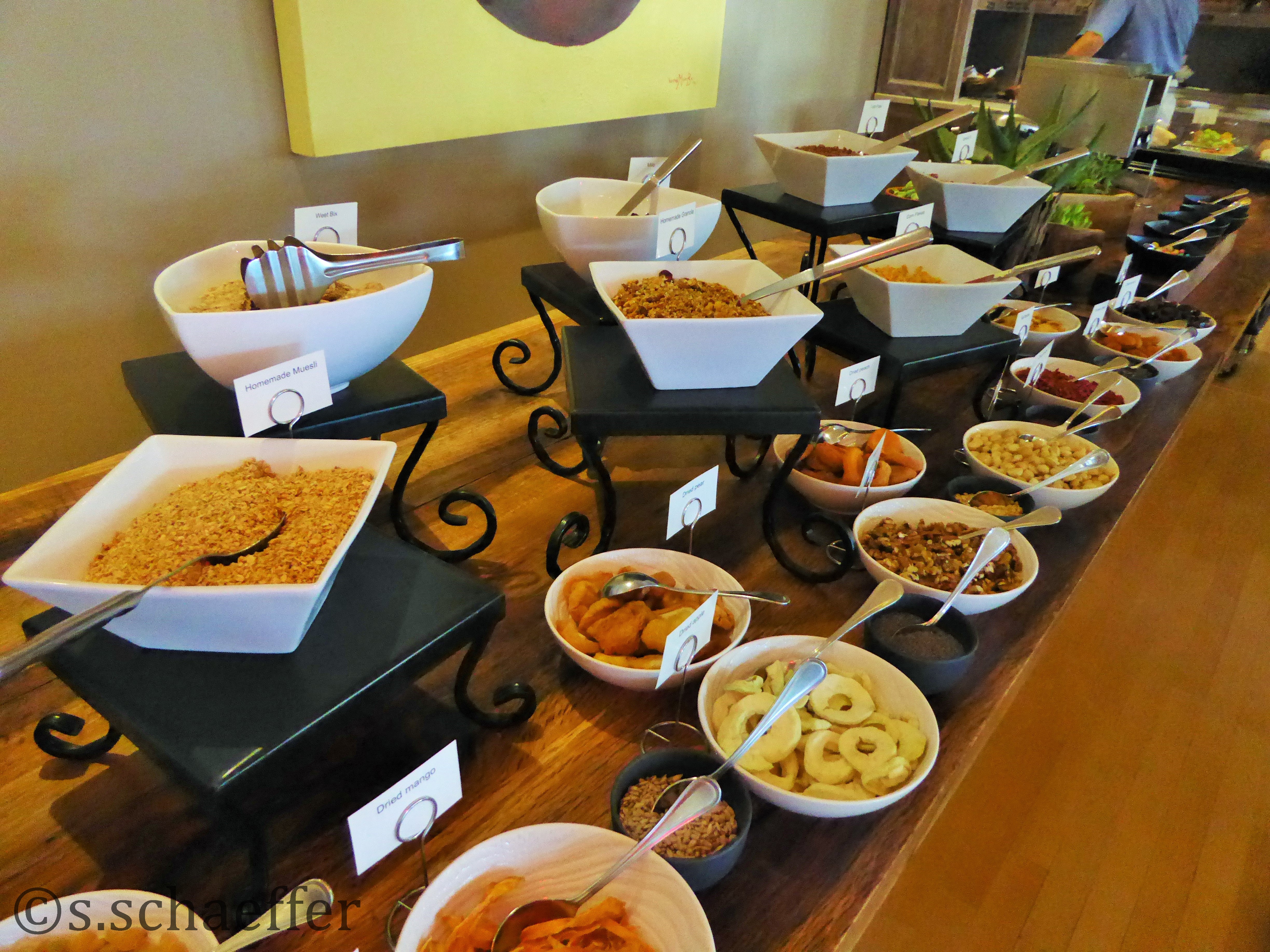 Da gibt es frisch gepresste Smoothies wie Kiwi-Spinat, Mango und Papaya, alle Obstsorten wunderbar zurecht geschnippelt, Yogurt und Quark, eine meterlange Theke mit Cerealien, Trockenobst und Körnern. Zwei Regalwände mit Brot-. Brötchen- und Gebäcksorten, Müslischnitte, Apfelküchlein, Croissants bis hin zu Quiches.