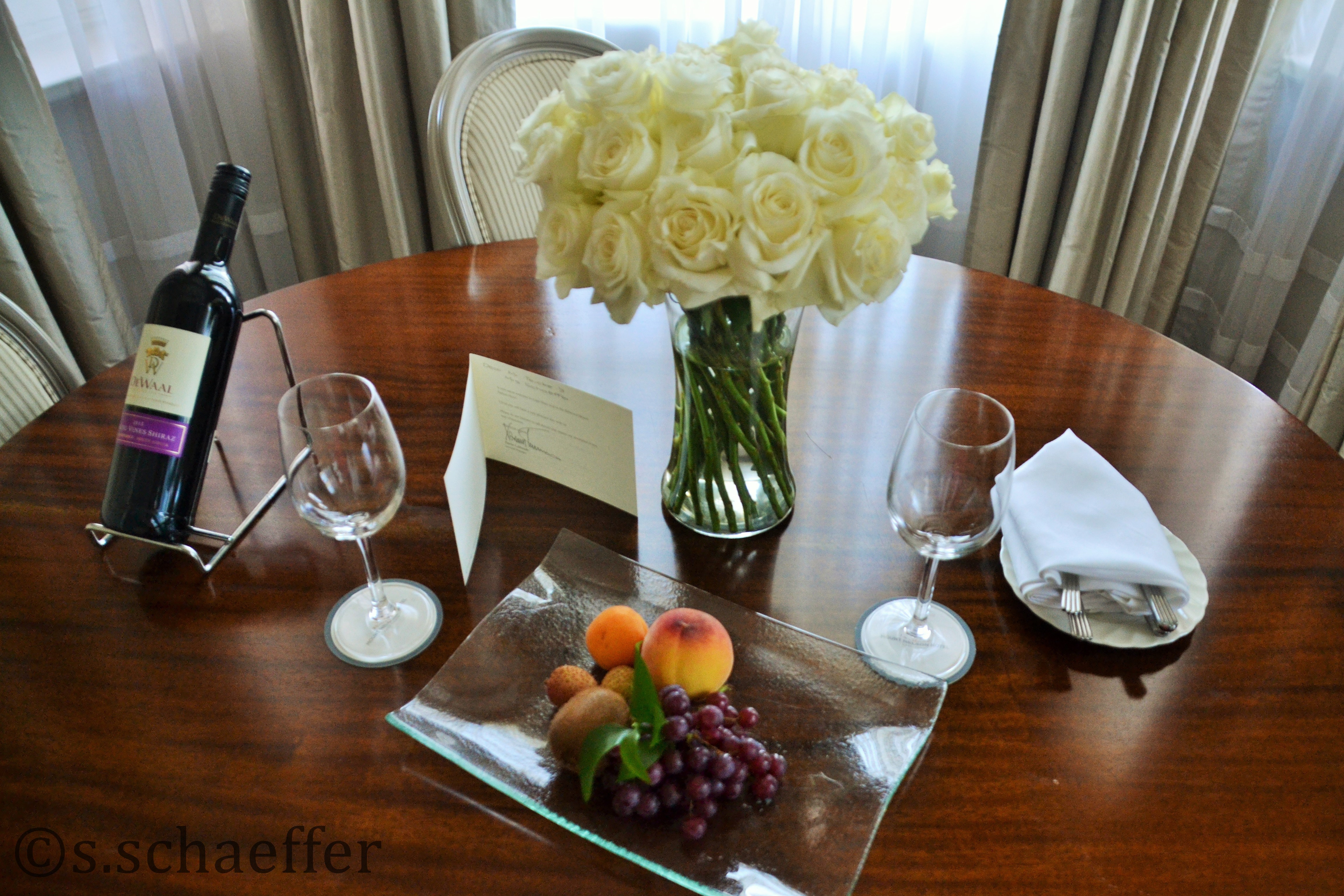 Auf dem Tisch begrüßen uns ein Obstkorb und eine gute Flasche südafrikanischer Rotwein.