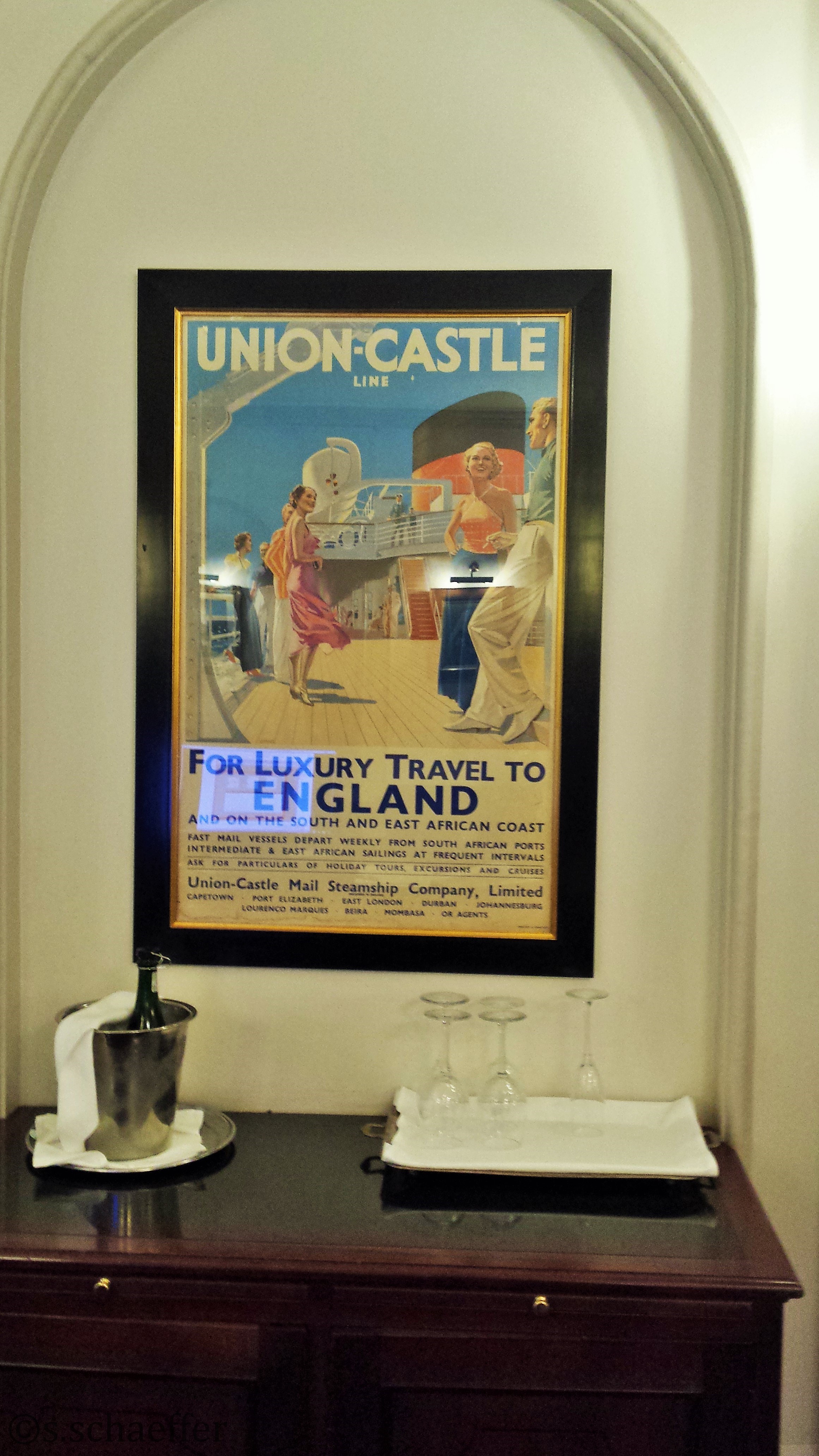 Hintergund: Das noble Haus wurde im Jahr 1899 als Hotel der Union Castle Dampfschifffahrtsgesellschaft eröffnet und noch heute sind wie hier an der Rezeption Teile des Schiffsmobiliars in manchen Bereichen des Hotels zu finden.
