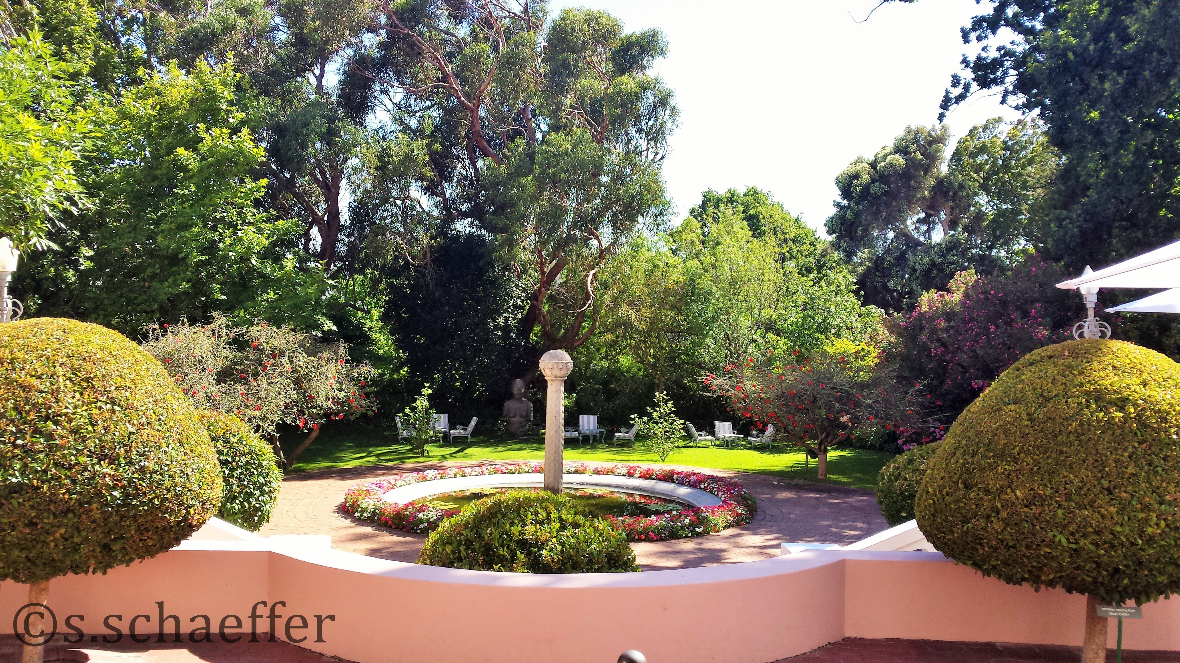 Von allen sieben Fenstern schauen wir in den wunderschönen parkähnlichen Garten, der die breite Botanik des Kaps abzubilden scheint, so vielfältig ist die Vegetation.