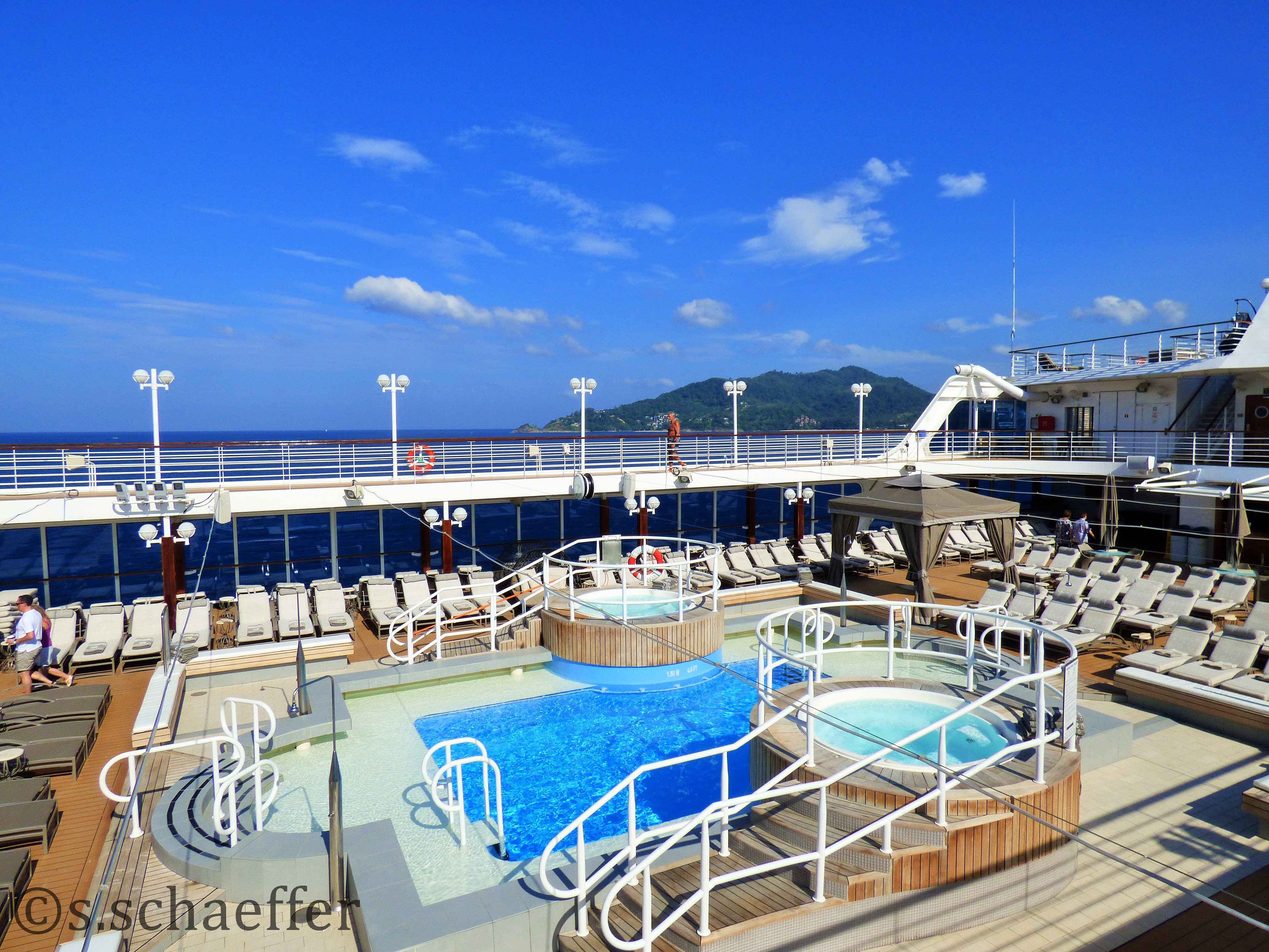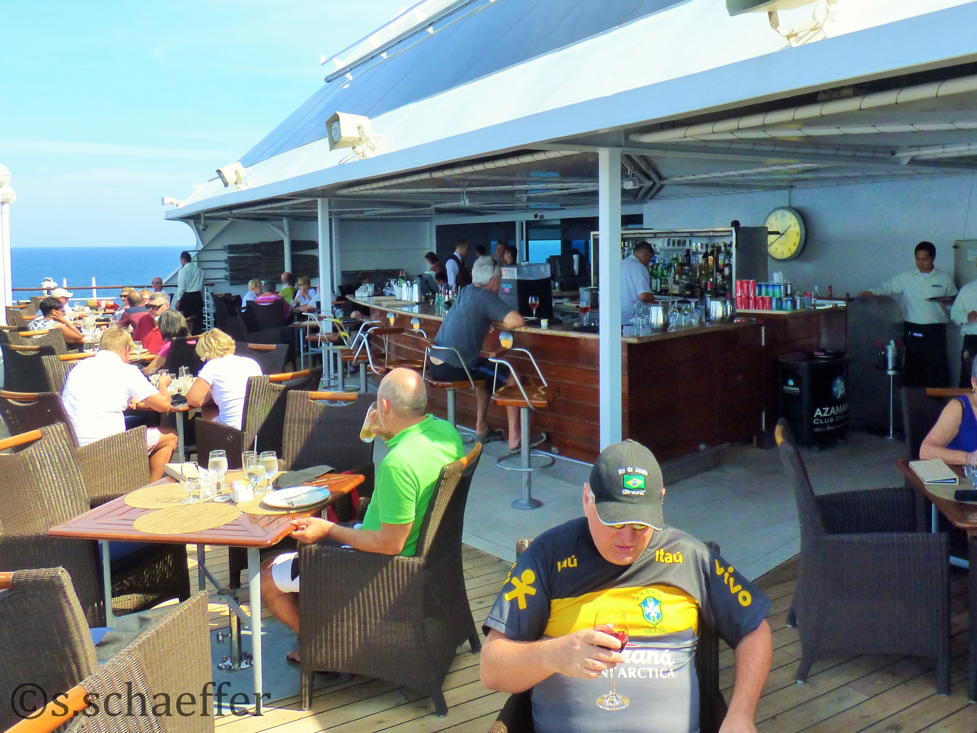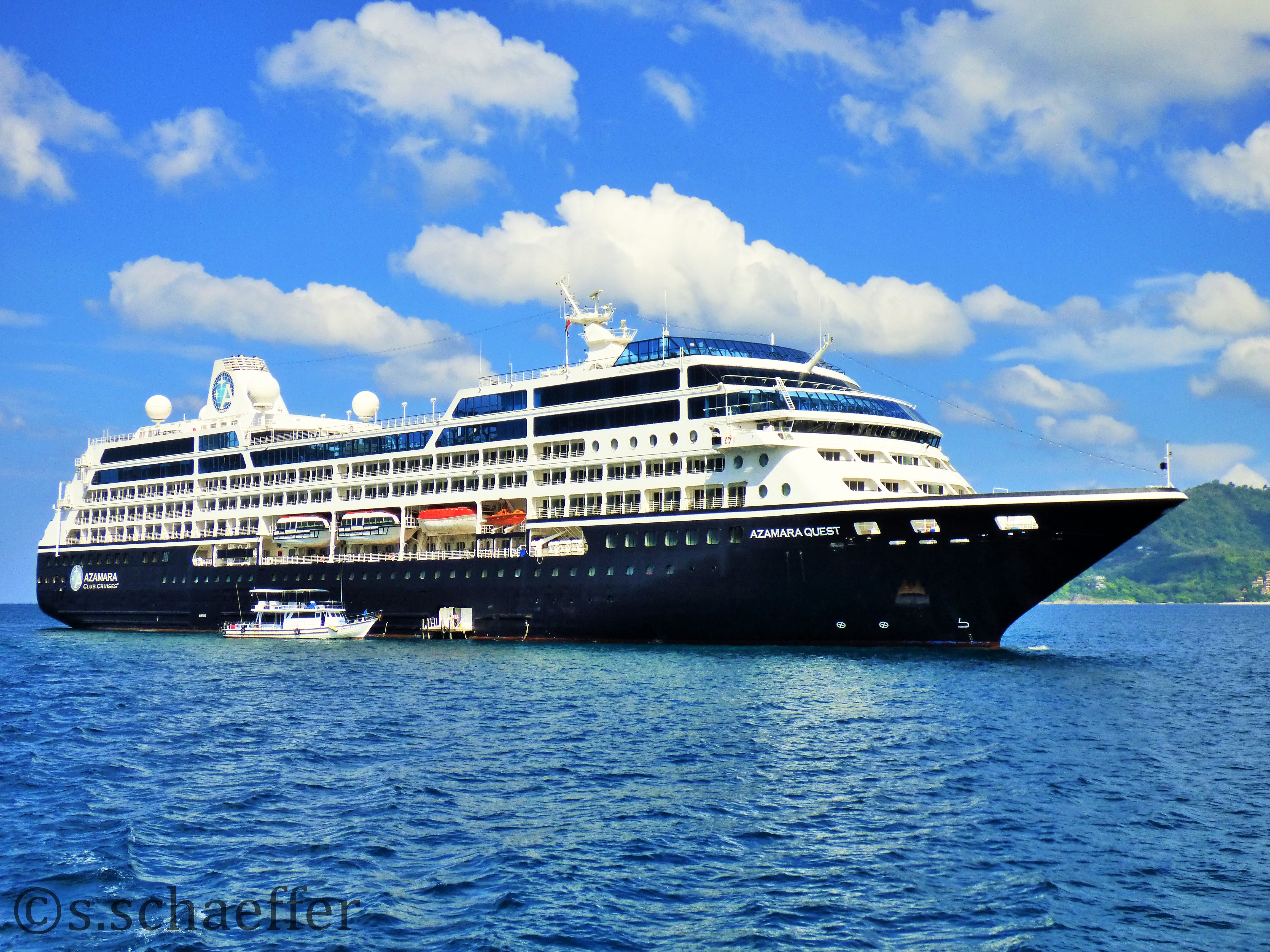 Wir stehen an der Reling der Azamara Quest, einem sehr komfortablen Boutique-Liner mit Clubatmosphäre.