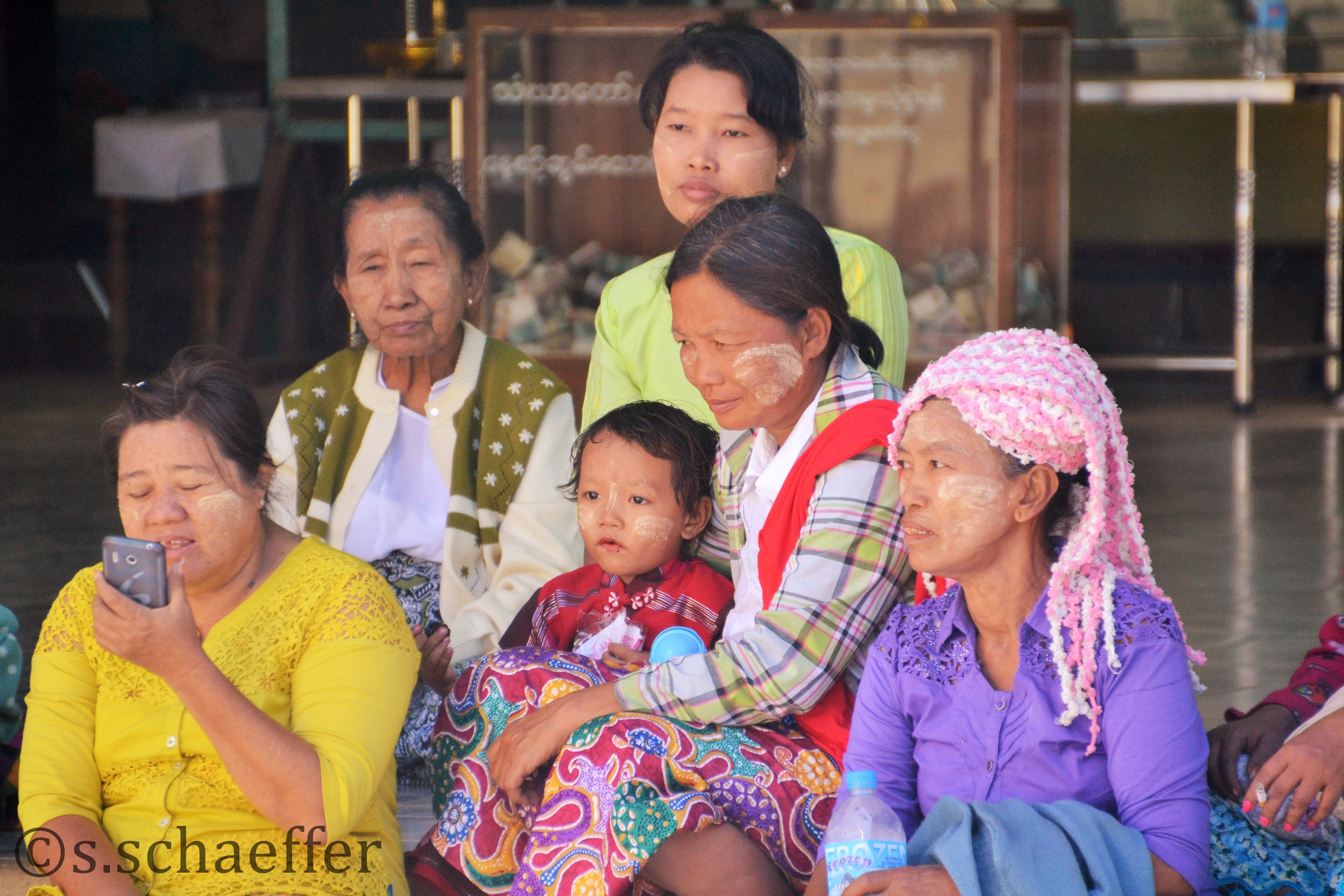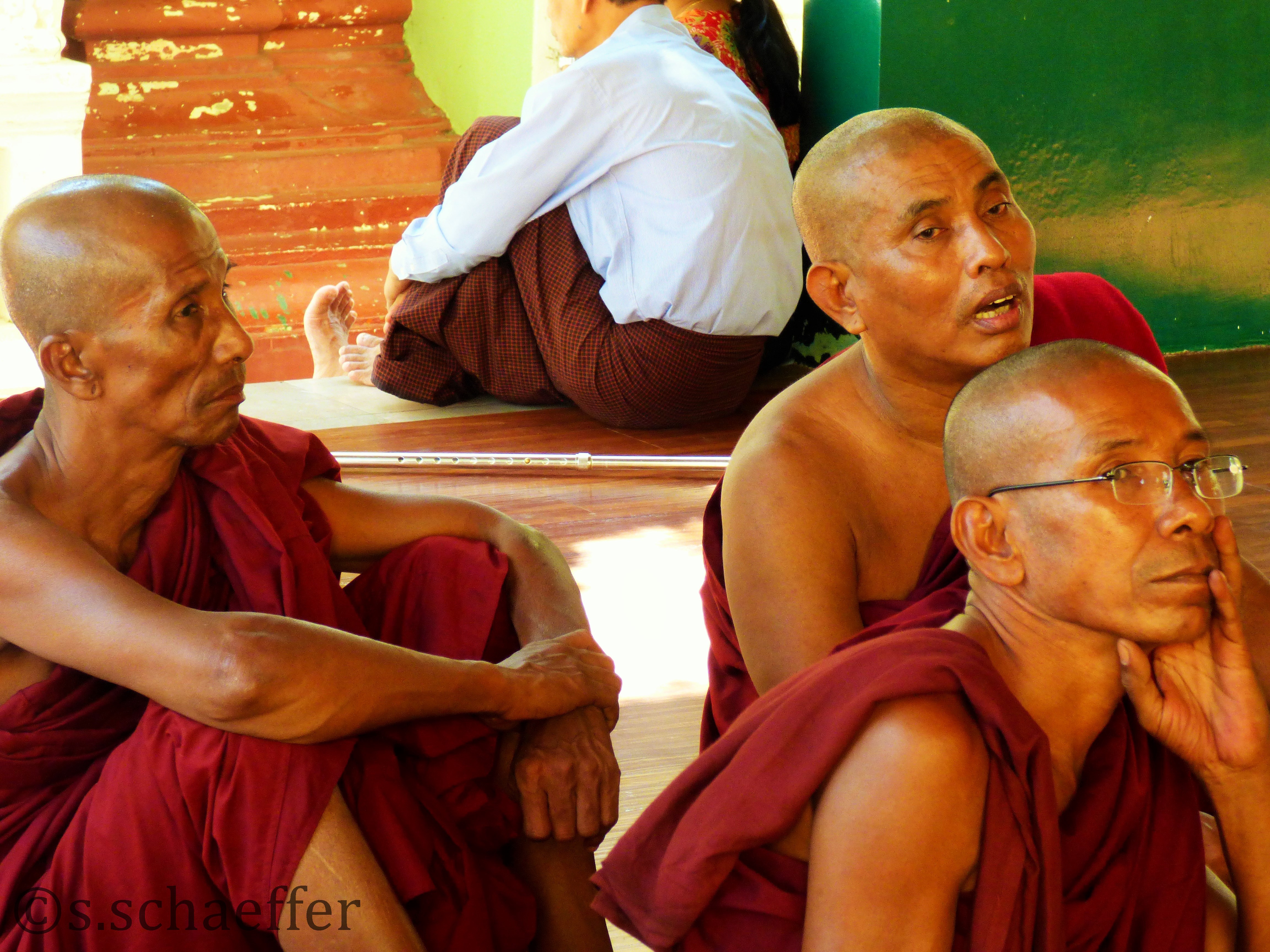 Die Shwedagon Pagode ist für jedermann geöffnet und eine Art Marktplatz. Wir beobachten alle Bevölkerungsgruppen – ob armer Reisbauer oder schlecht bezahlter Universitätsprofessor aus Yangon, ob Greisin am Stock oder Kinder mitsamt ihrer Nanny. Unter den Bäumen und Pagodendächern pausieren Mönchen, Familien vespern in Papier eingewickelten Reis und mitgebrachtes Obst.
