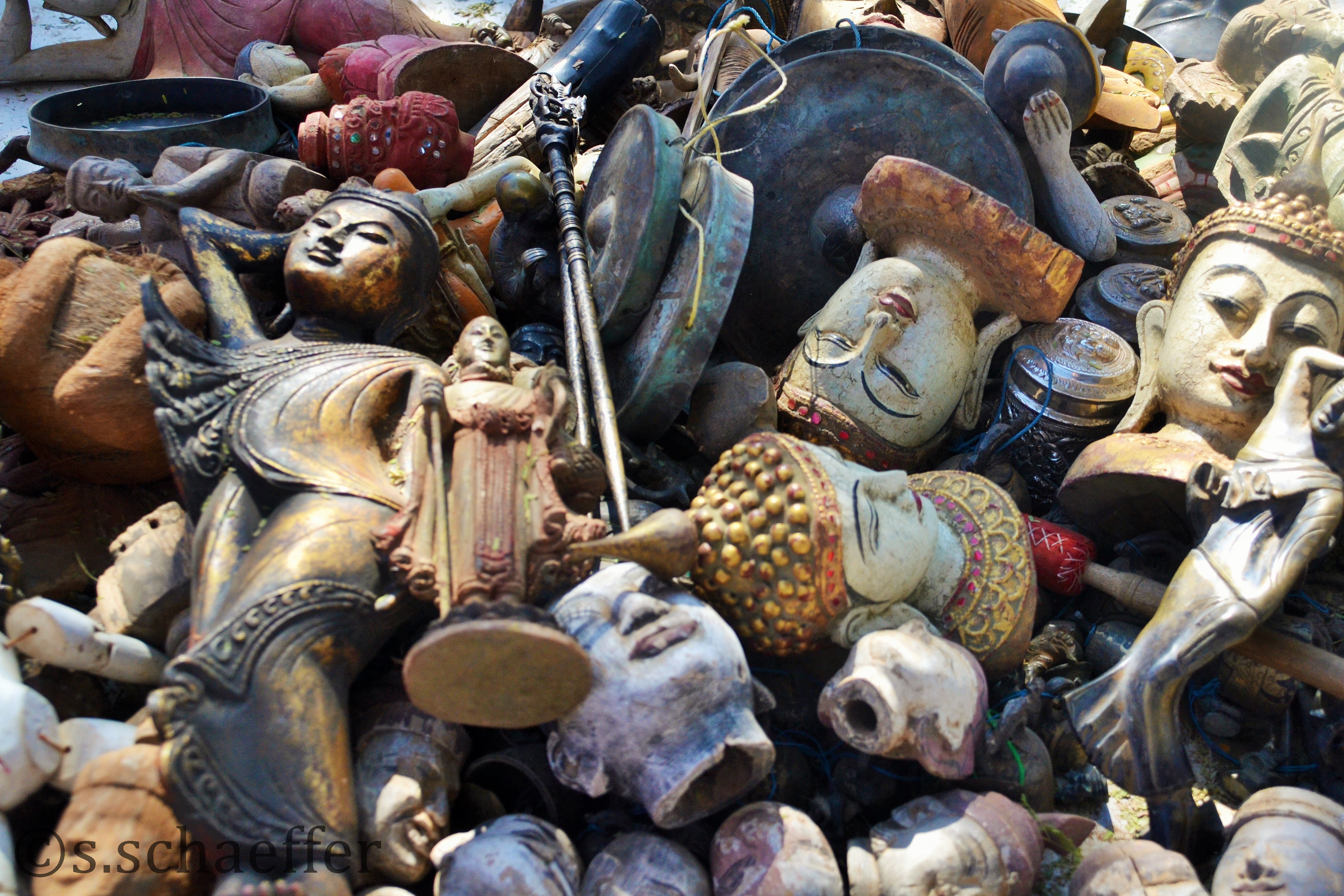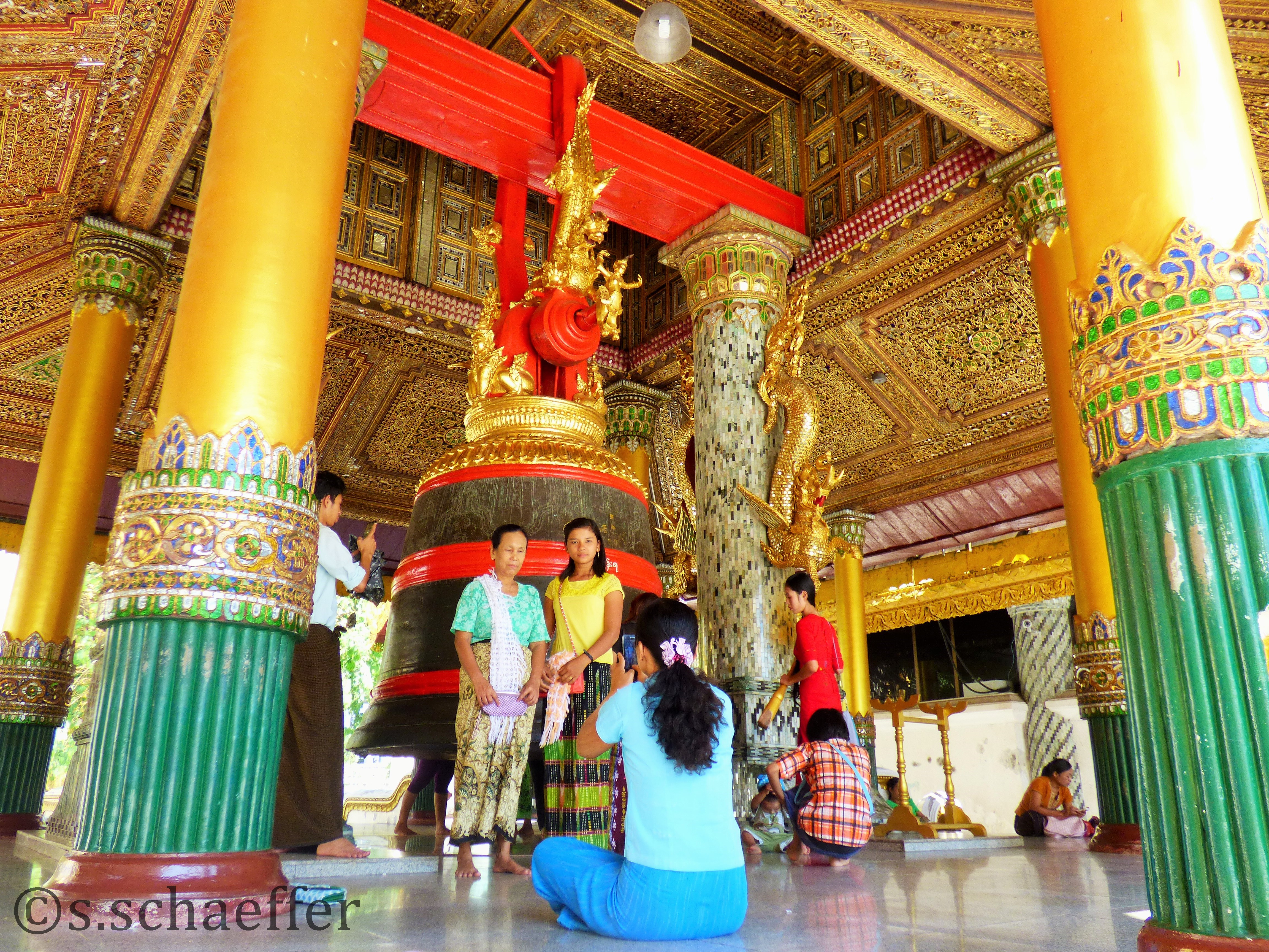 Ich stoppe an der Ecke, wo die Tempel der einzelnen Wochentage stehen, gehen zu dem einen ganz links, „meinen“ Montag und tue es den Gläubigen gleich. Schade, dass sich die Hauptpagode derzeit im oberen Teil in Restauration befindet und deshalb nur halb so golden glitzert. Trotzdem gilt der Werbeslogan, den wir auf Plakaten bei der Rückfahrt zum Schiff lesen: Myanmar – Goldenes Land! Wir wollen wiederkommen mit noch mehr Zeit!