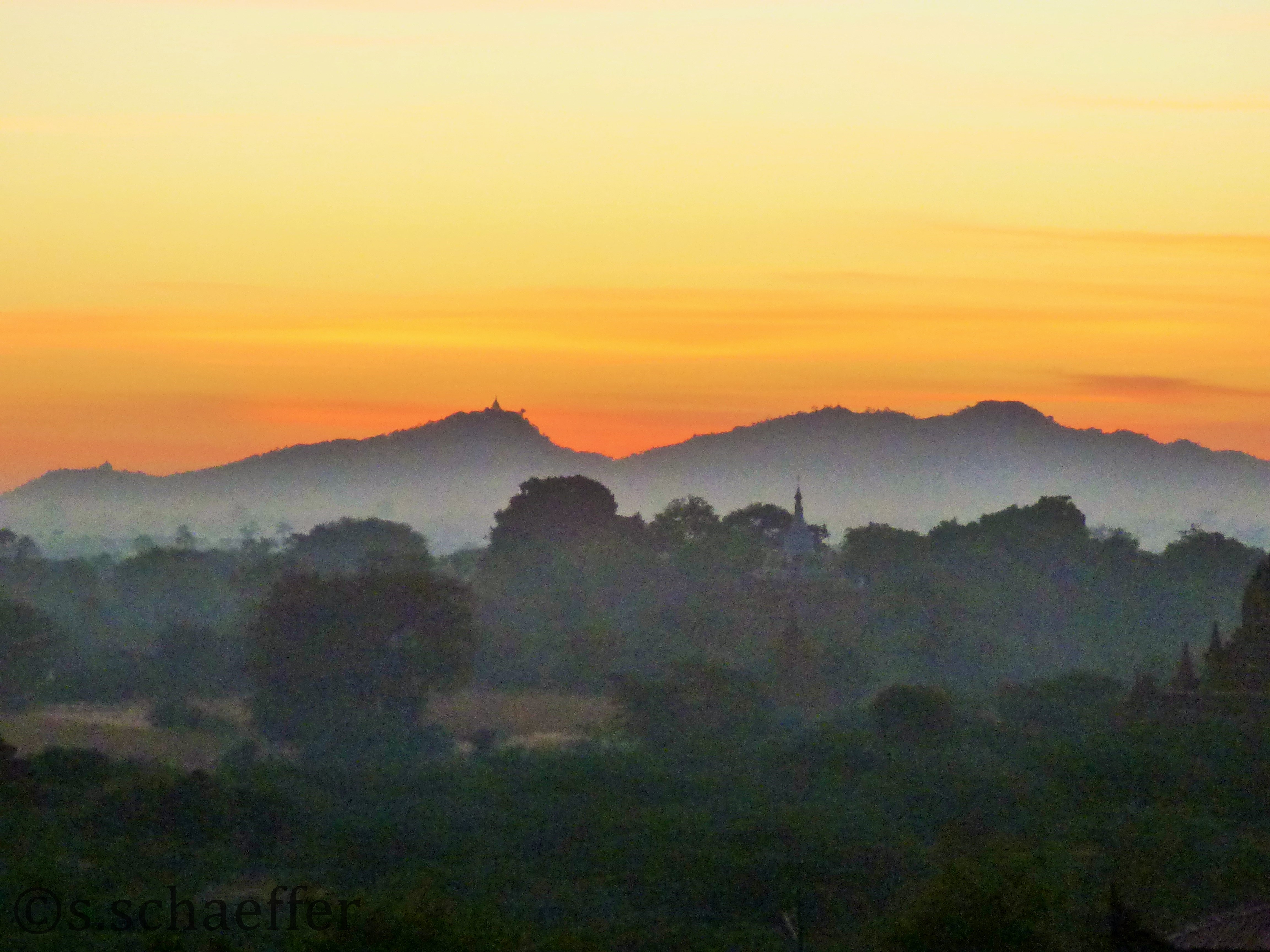 Pünktlich zum Sonnenuntergang sitzen wir auf den roten Steinen des Dhammayangyi Patho. Dieser Koloss von Tempel ist zwar zu dieser Tageszeit überfüllt, aber mit Recht: Atemberaubend ist dieses 380 Grad-Panorama eingetaucht in das Lichtspiel – hunderte rote Sahnehäubchen wie von Zauberhand mit einer Spritzpistole hingetupft liegen um uns herum verteilt, dazwischen wahllos kleine Baumgrüppchen.